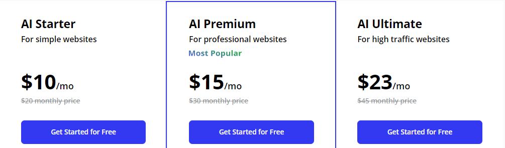 10Web Business方案提供三种套餐:AI Starter($10/月)适合简单网站,包含5K字内容生成和10GB存储;AI Premium($15/月)适用于专业网站,提供50K字内容生成、15GB存储和50K访问量;AI Ultimate($23/月)适合高流量网站,提供无限内容生成、20GB存储和100K访问量。所有方案支持Elementor拖放编辑器、SEO优化、快速托管及自动SSL证书。