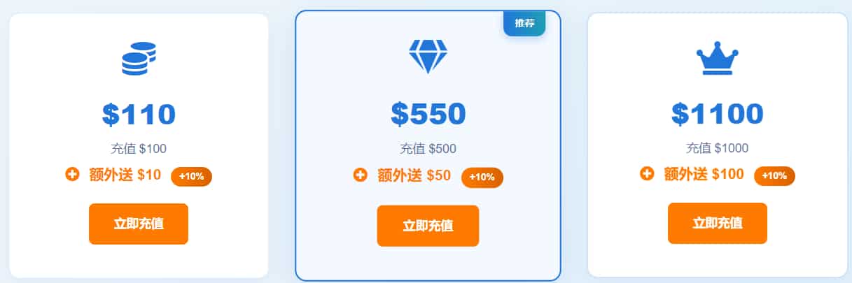 所有充值档位均享受10%加赠奖励!一次性大额充值,后续购买服务更省心,账户余额永不过期。