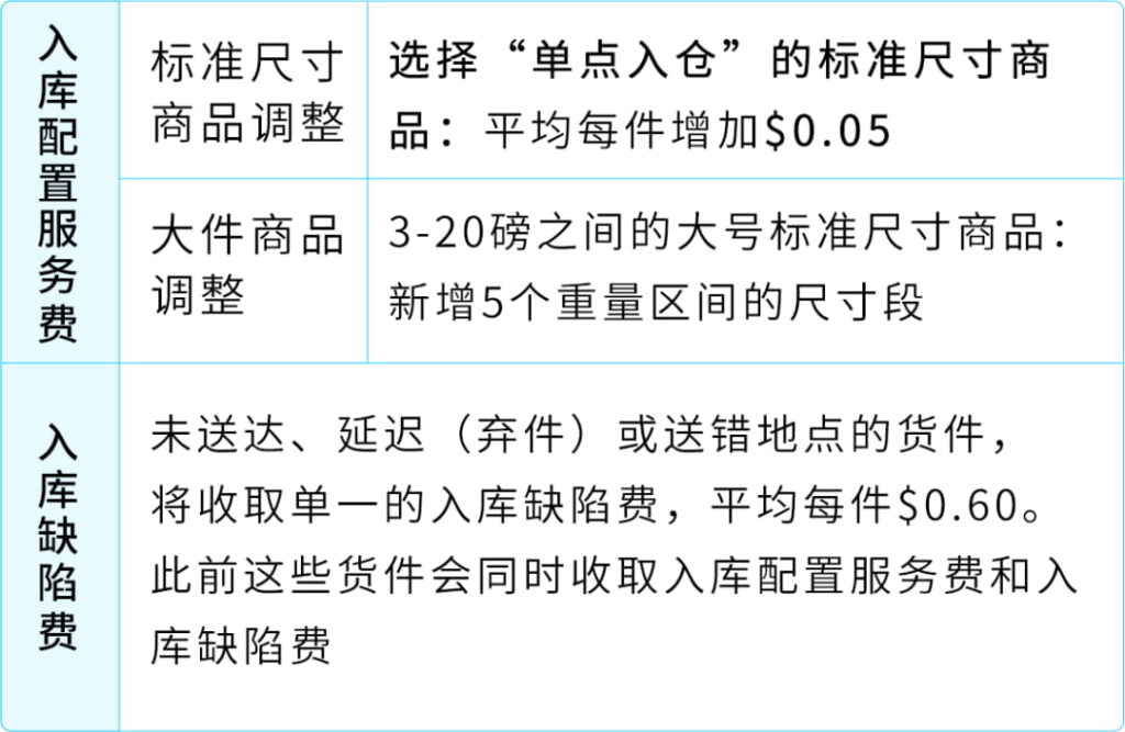 库龄12–15个月的商品:最低超龄库存费用将每件每月增加$0.15.每件每月上调至$0.30.此费用将继续基于更新后的每件$0.30或每立方英尺$6.90(保持不变)二选一取其高计费。