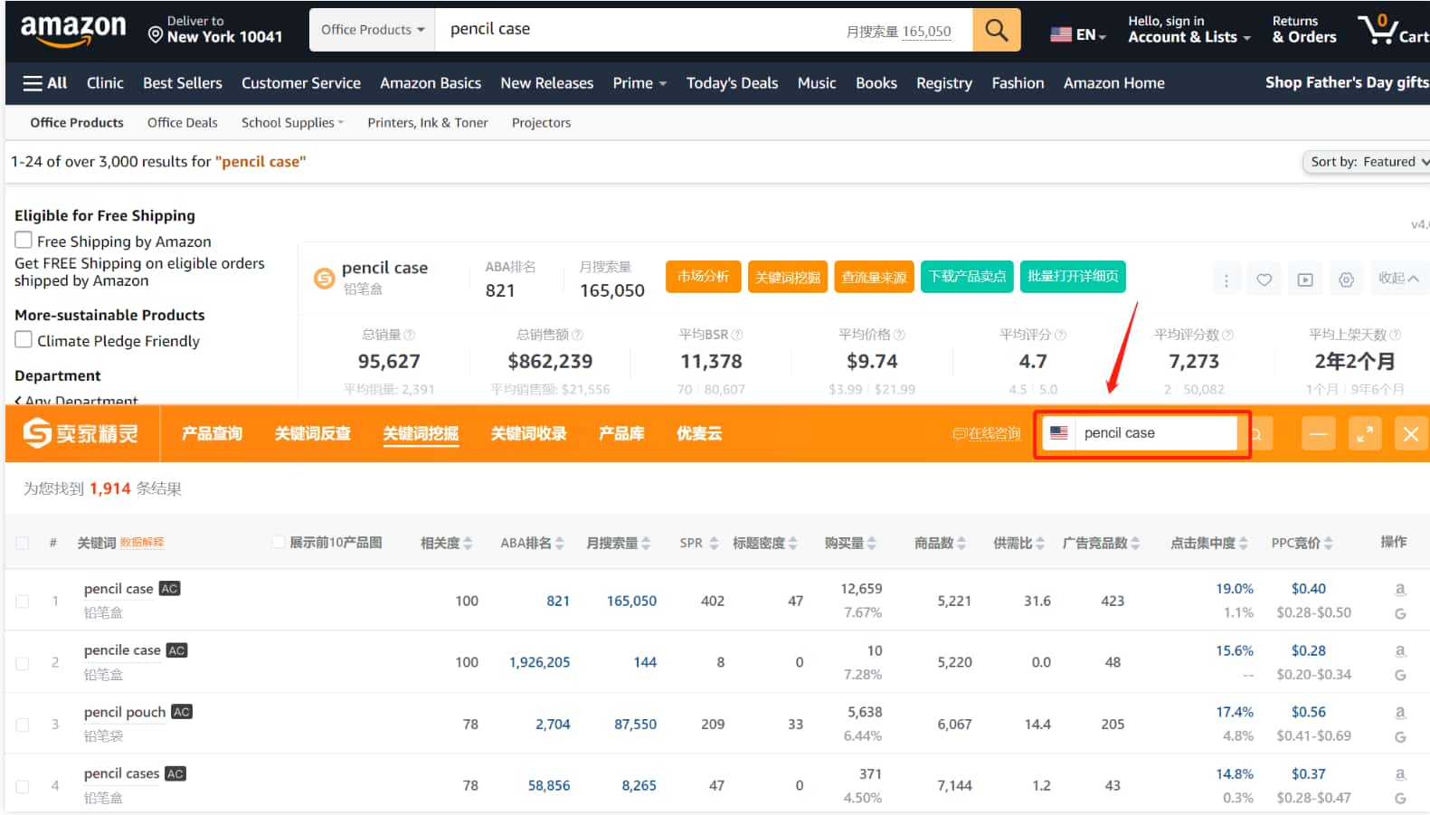 以关键词pencil case为例,在亚马逊搜索结果页打开卖家精灵插件-关键词挖掘,就会自动填充关键词进行查询,通过该关键词一共挖掘出了1914个相关关键词。