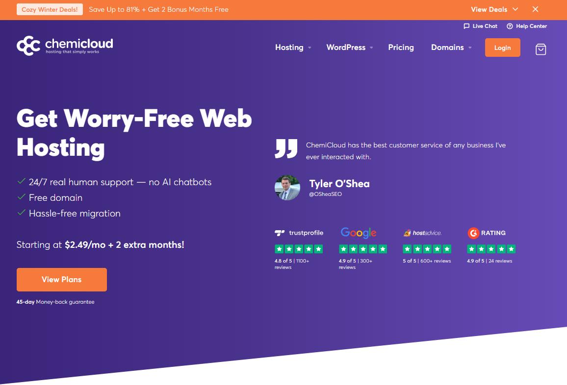 ChemiCloud正式推出温馨冬季优惠,涵盖国外虚拟主机、WordPress主机、托管WordPress、VPS云主机和经销商主机,全场最高可享81%(1.9折)折扣优惠,其中虚拟主机价格低至$2.49/月,另外额外赠送2个月,以及免费域名注册、免费网站迁移、免费每日备份、45天退款保证等一系列服务。