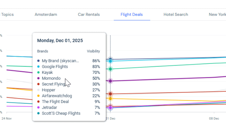 结合与航班相关的分析,这清楚地表明了这一模式,Skyscanner的AI可见性在以航班比较为中心的地方最强,而随着主题转向更广泛的预订决策,竞争对手则占据上风。