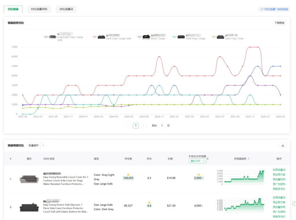 做竞品分析,第一件事是判断这个市场值不值得进、对手现在走势如何。把几个目标竞品输进来,看销量曲线——谁在上升期、谁在稳定期、市场是在增长还是收缩,帮你判断有没有机会进这个类目。