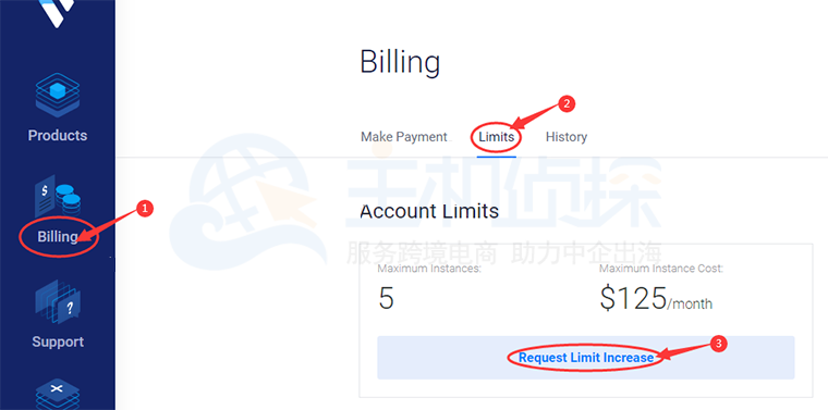 登录 Vultr 官网,在官网后台首页点击左侧面板的“Billing”进入,然后点击“Limits”,再次点击“Request Limit Increase”进行设置,如图: