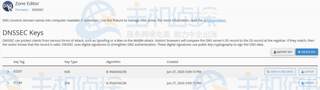 您现在可以随时通过区域编辑器中的 cPanel 查看这些 DNSSEC 密钥: