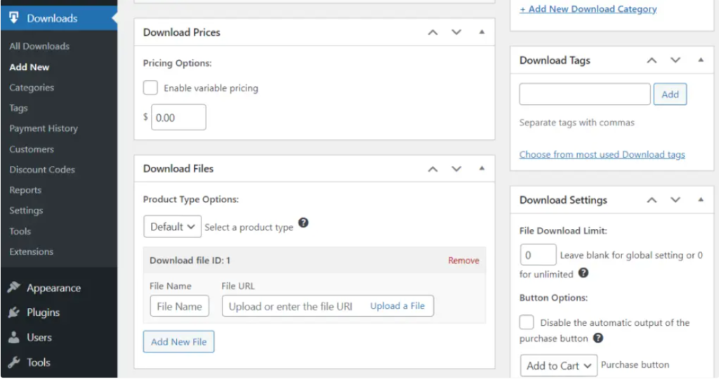 添加新文件以供下载时,Easy Digital Downloads使用类似于创建新文章的过程。您可以配置文件的所有详细信息,为其设置价格,并将其发布在您的网站上。