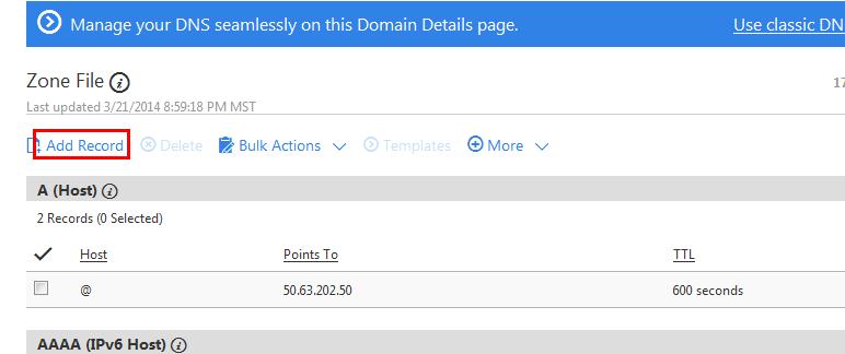 2.进入后我们可以看到该域名的详细信息,在“DNS Zone File”下面,我们找到如图所示的地方,选择”Add Record“添加记录。