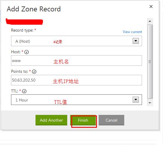 3.在弹出的对话框中,我们在下拉框中选择添加A记录,然后填写相应的主机名、IP地址等信息(这里以添加www为演示操作),确认完成后点击“Finish”按钮。